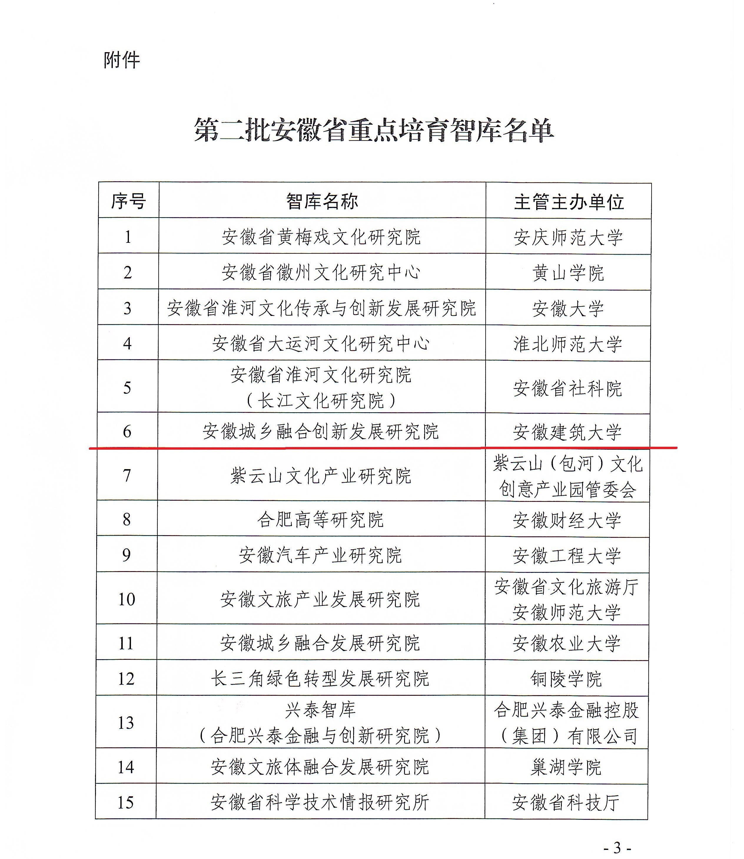 本网讯  近日,中共安徽省委宣传部公布了2025年第二批安徽省重点培育智库立项名单,我校“安徽城乡融合创新发展研究院”成功获批“安徽省重点培育智库”。