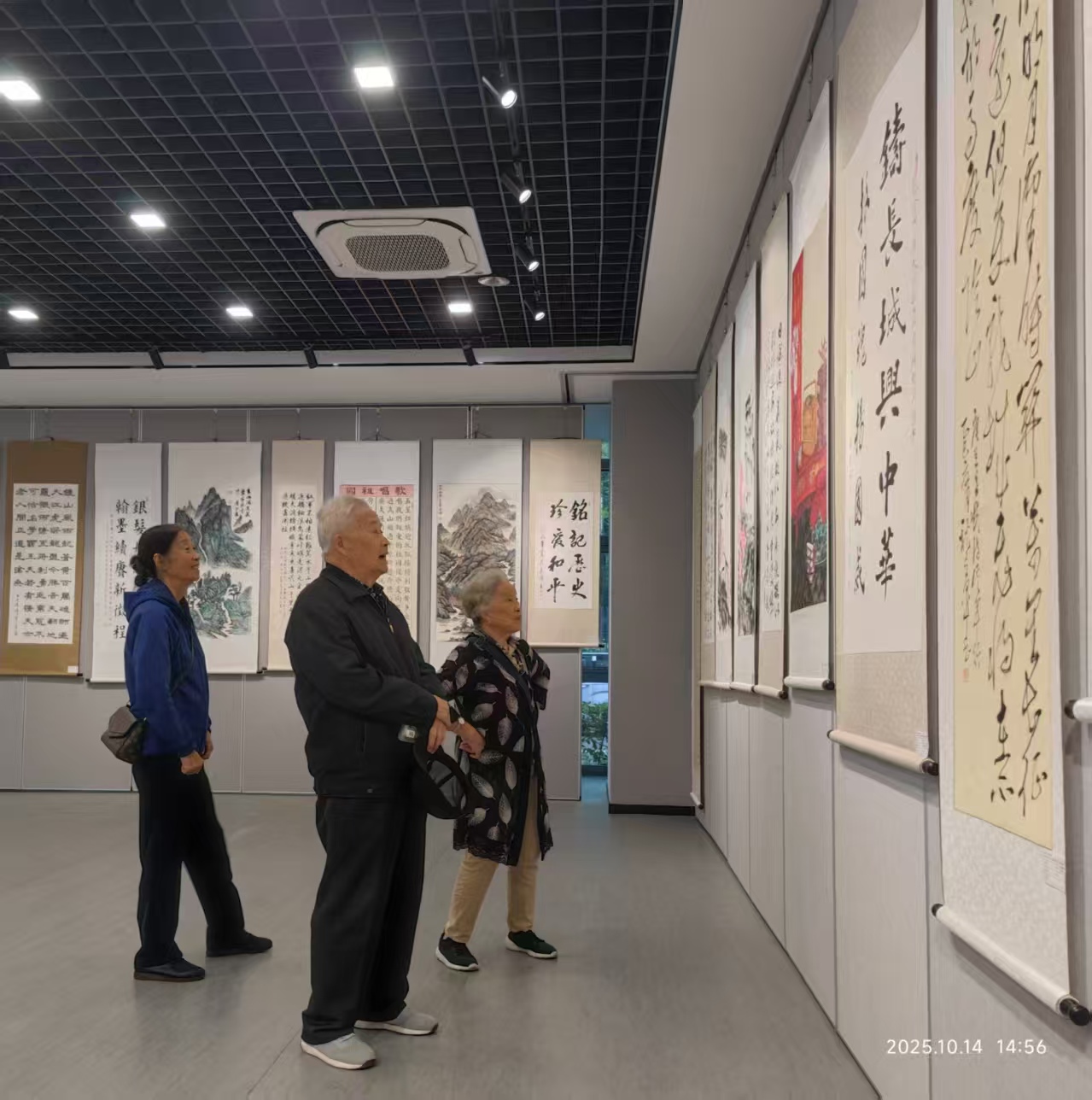 10月14日下午,学校老年书画摄影研究会组织会员前往合肥老年大学,参观市老干部局开展的“银发丹心忆抗战 翰墨赓续新征程”全市老干部系统书画摄影展。