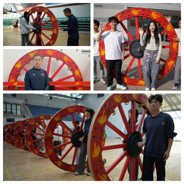 省级非物质文化遗产“轩辕车”项目吸引了众多新生参与,项目以涂满鲜红彩绘的巨型车轮为道具,展现千年民俗的健身娱乐价值。在指导教师杜卫提的悉心指导下,20名同学合力推动涂满鲜红彩绘的巨型车轮,深切感受非遗体育项目的独特魅力。“轩辕车不仅是一项传统体育活动,更是一种团队协作的考验,”杜卫提老师介绍,“它需要所有参与者心往一处想、劲往一处使,这正是当代学子必须具备的团队精神。”